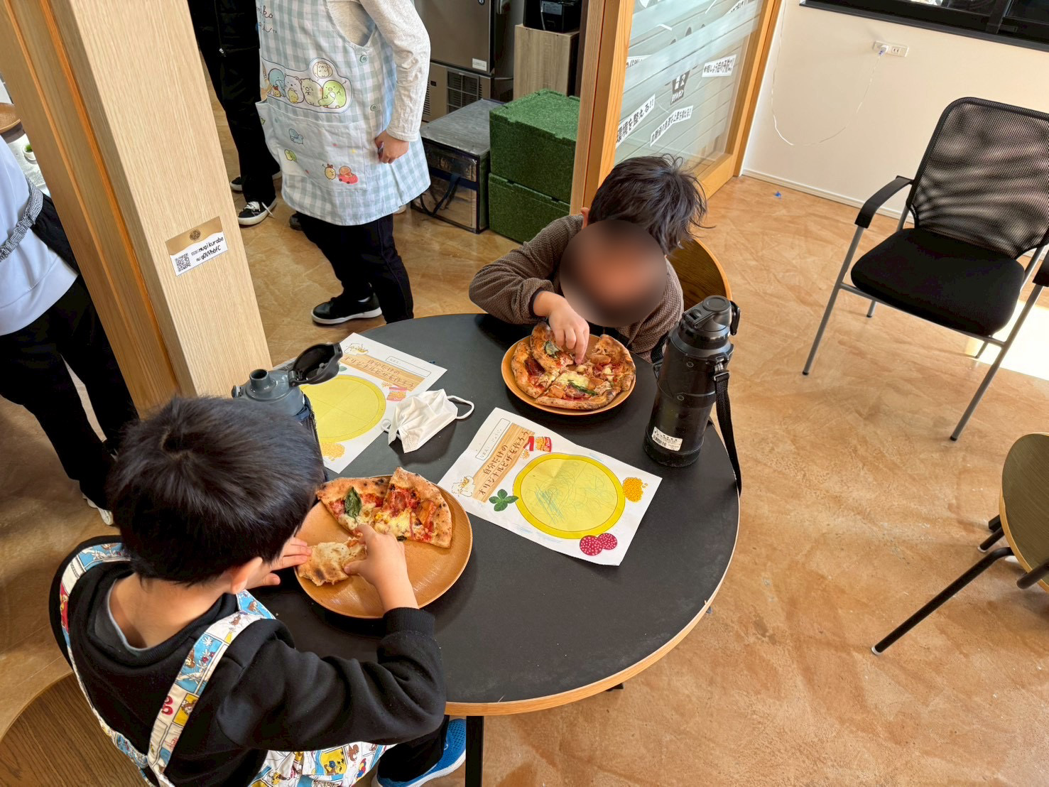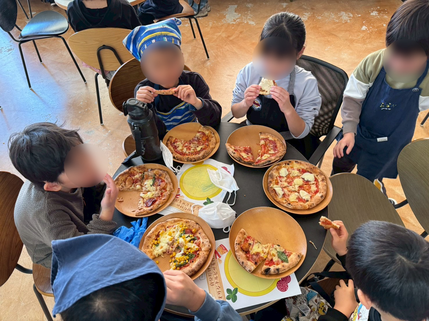 焼き上がったピザがテーブルに並ぶと、子どもたちはお互いのピザを見比べながら楽しそうな様子。それぞれの工夫が光るピザが完成しました。