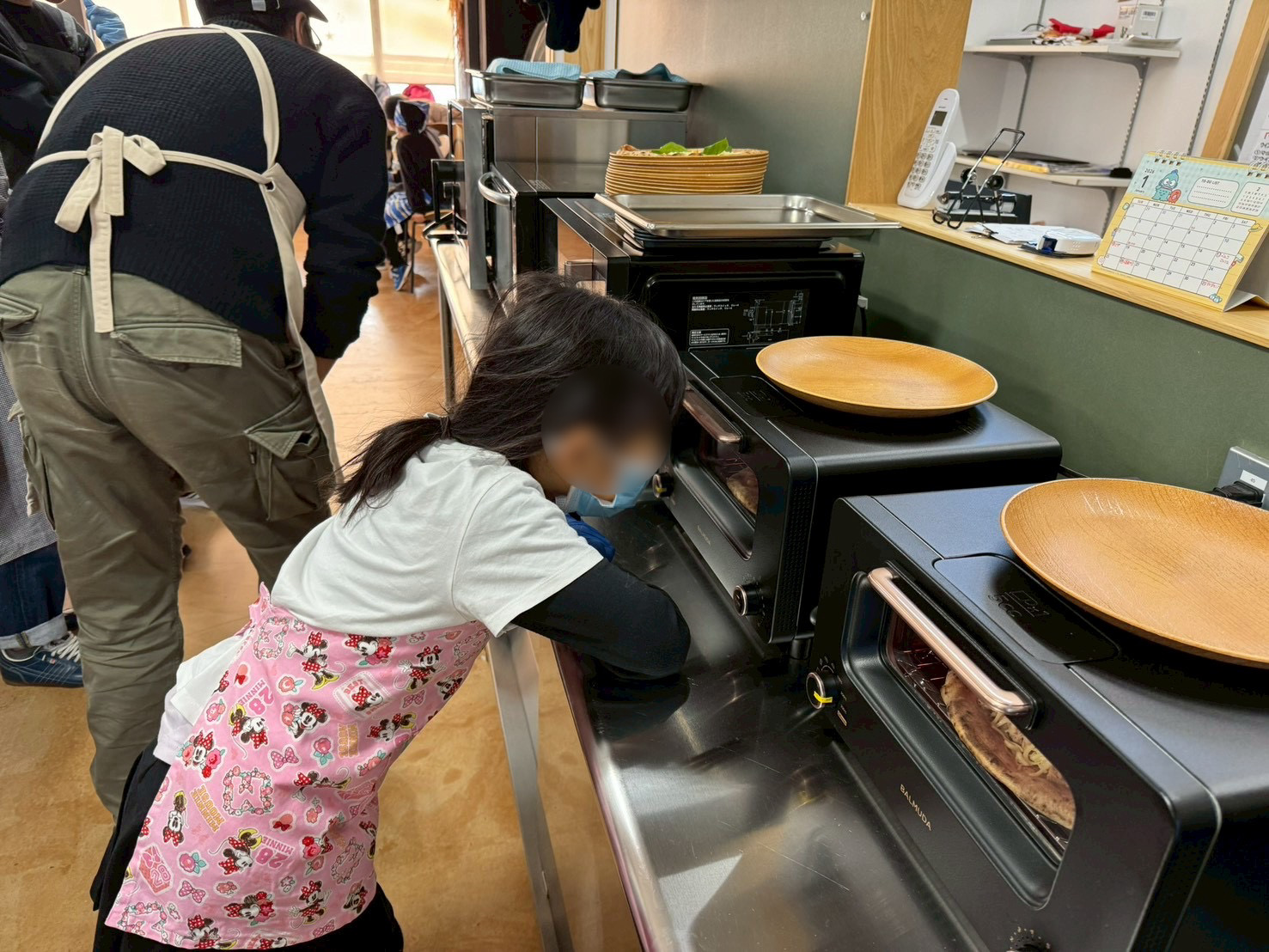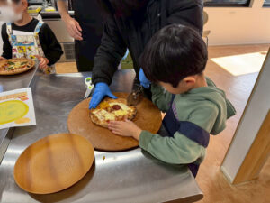 トッピングが終わると、いよいよ焼き上げの時間。オーブンから香ばしい香りが広がると、子どもたちは目を輝かせながら「早く焼けないかな♩」と、待ちきれない様子でした。