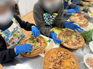 デザインができたら、いよいよピザ作りに取りかかります。子どもたちは、もちもち生地に、チーズやサラミ、チキン、野菜など自由にトッピングをのせていきます。型抜きを使ってアレンジする子もいれば、みんな思い思いの工夫を加えながら、自分だけのオリジナルピザ作りに夢中になって作業する姿が見られました。