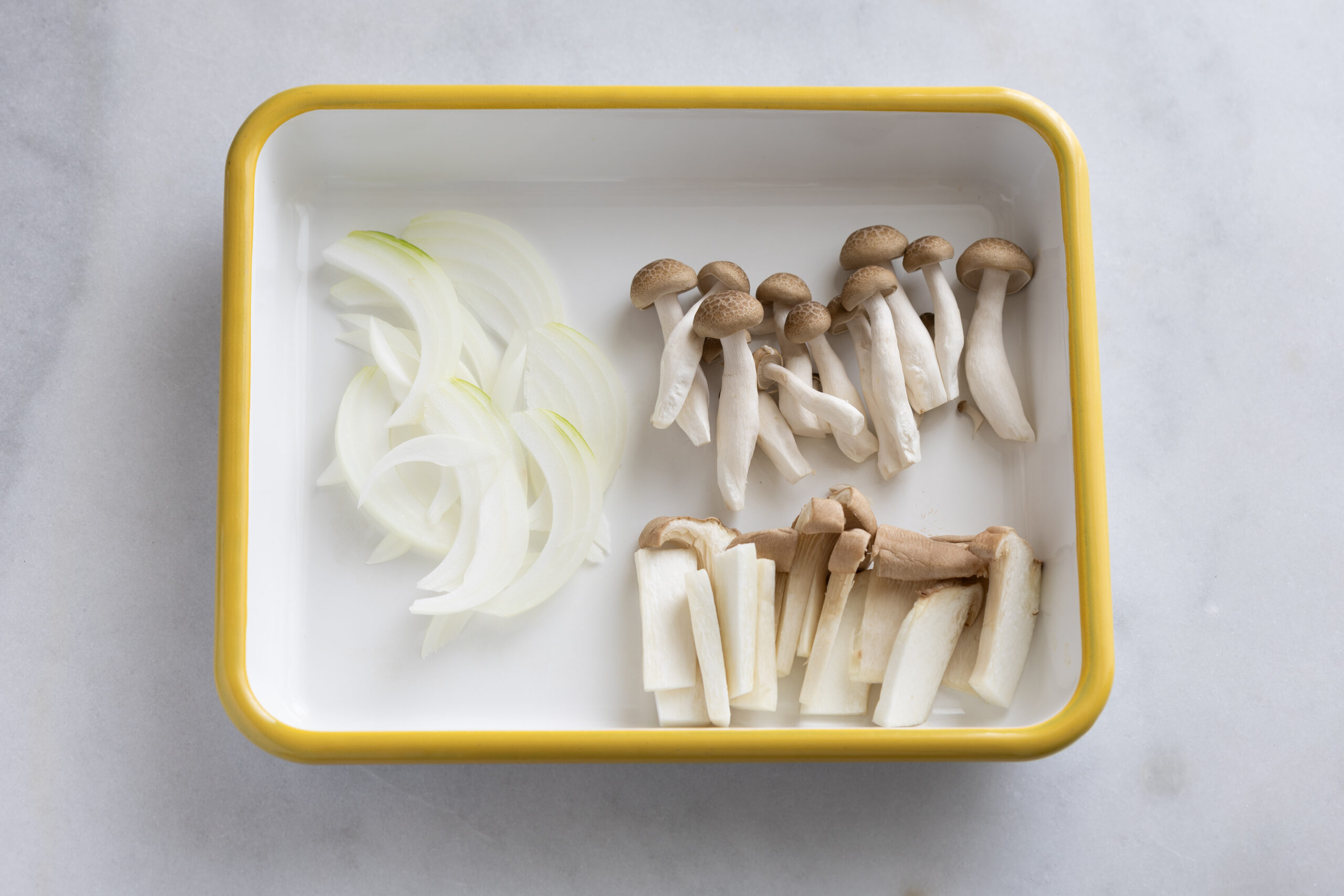 玉ねぎは薄切りにする。しめじは石づきを切り、小房に分ける。エリンギは長さを半分に切り、5mm幅位の薄切りにする。
