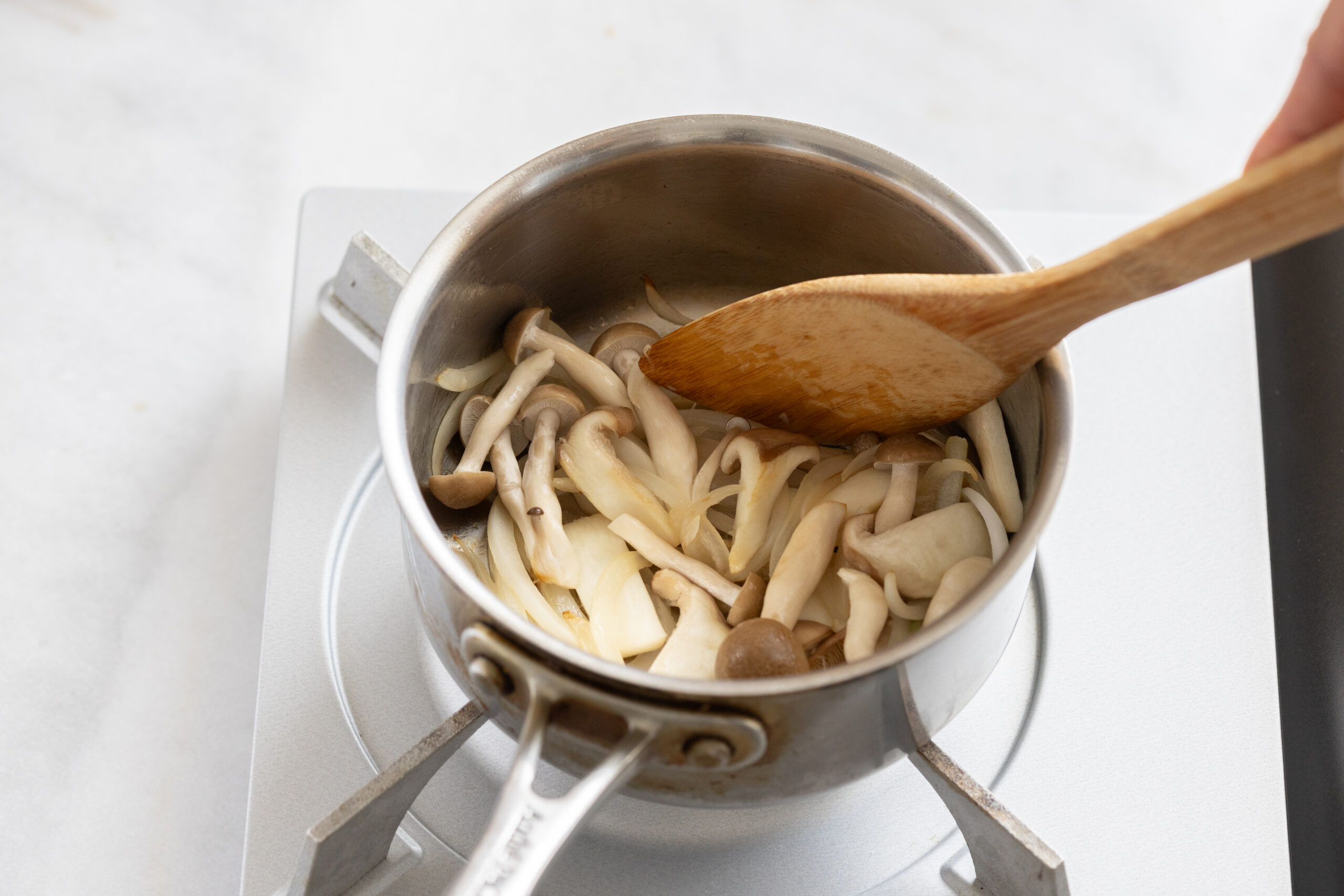 鍋にサラダ油を入れ、薄切りにした玉ねぎ、しめじ、エリンギ、おろしにんにくを入れて炒める。