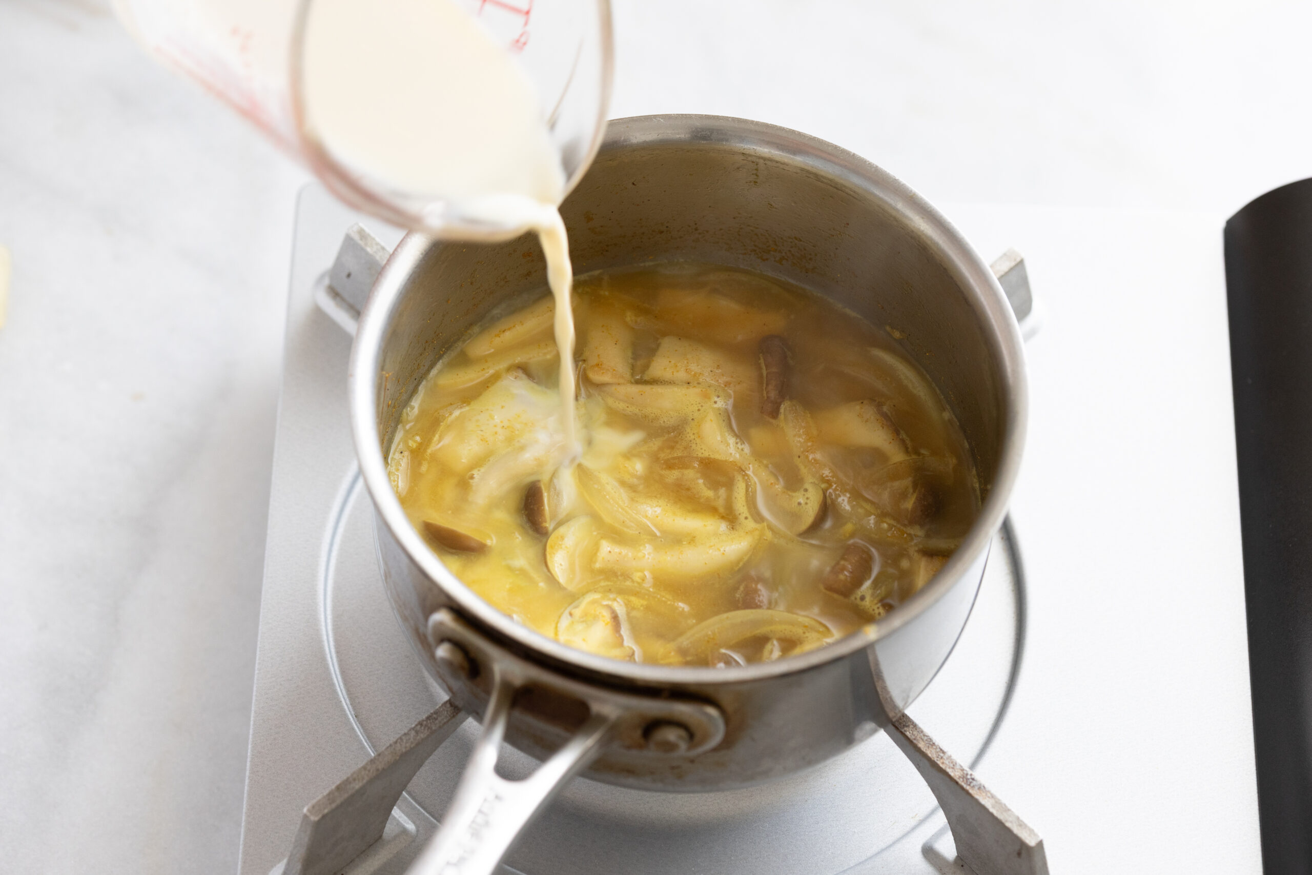 カレー粉を入れて軽く炒め、水、コンソメ(顆粒)、塩、無調整豆乳を入れる。